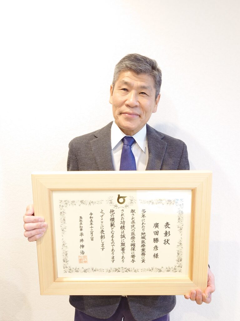 真誠会セントラルクリニック 廣田 勝彦さんが、12月2日に鳥取県平井知事より地域医療功労表彰を受賞されました。廣田さんは長年、鳥取大学医学部附属病院放射線部に勤務されており、2018年よりセントラルクリニックの放射線技師として活躍されています。