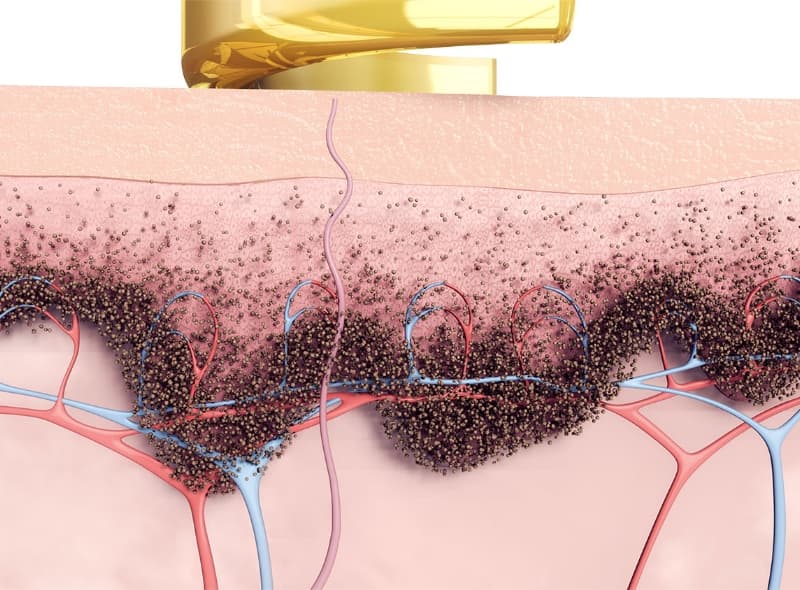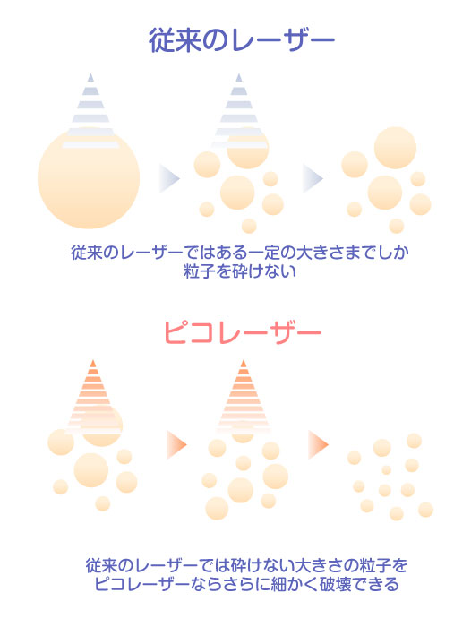 レーザーが短いほど、肌に熱ダメージを与えずにメラニン色素をより細かい粒子に壊すことができます。